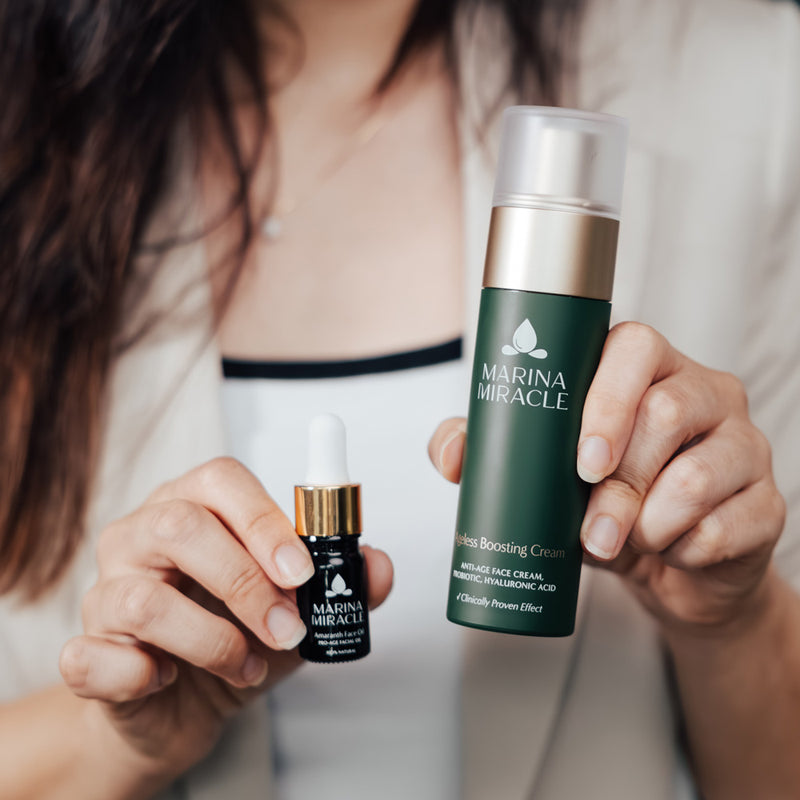 Amaranthus caudatus frögroddsjäst (anka) olja*+, Oryza sativa fröolja (anka) Hippophae Rhamnoides fröextrakt*+, Tremella fuciformis extrakt (anka) natriumhyaluronat*+, Cannabis sativa fröolja*+, Myristylmyristat+, Simmondsia chinensis fröolja*+, Butyrospermum parkii smör*+, vattenkefirbiopolymer*+, glycerin (vegetabilisk)*+, cetylalkohol+, Rubus idaeus fröolja*+, Aspergillus/kaffefrö/risjäst filtrat*+, Solanum lycopersicum fruktextrakt*+, Sapindus saponaria fruktextrakt*+, allantoin+, natriumbensoat (och) kaliumsorbat, xantangummi (och) Amorphophallus konjakrotpulver+, metylsulfonylmetan (MSM), Avena sativa kärnmjöl*+, glucono delta-lakton (och) natrium Salicylat+, Glycerylkaprylat+, Bensylalkohol+, Kaliumsorbat+, Arom (naturlig doft)+